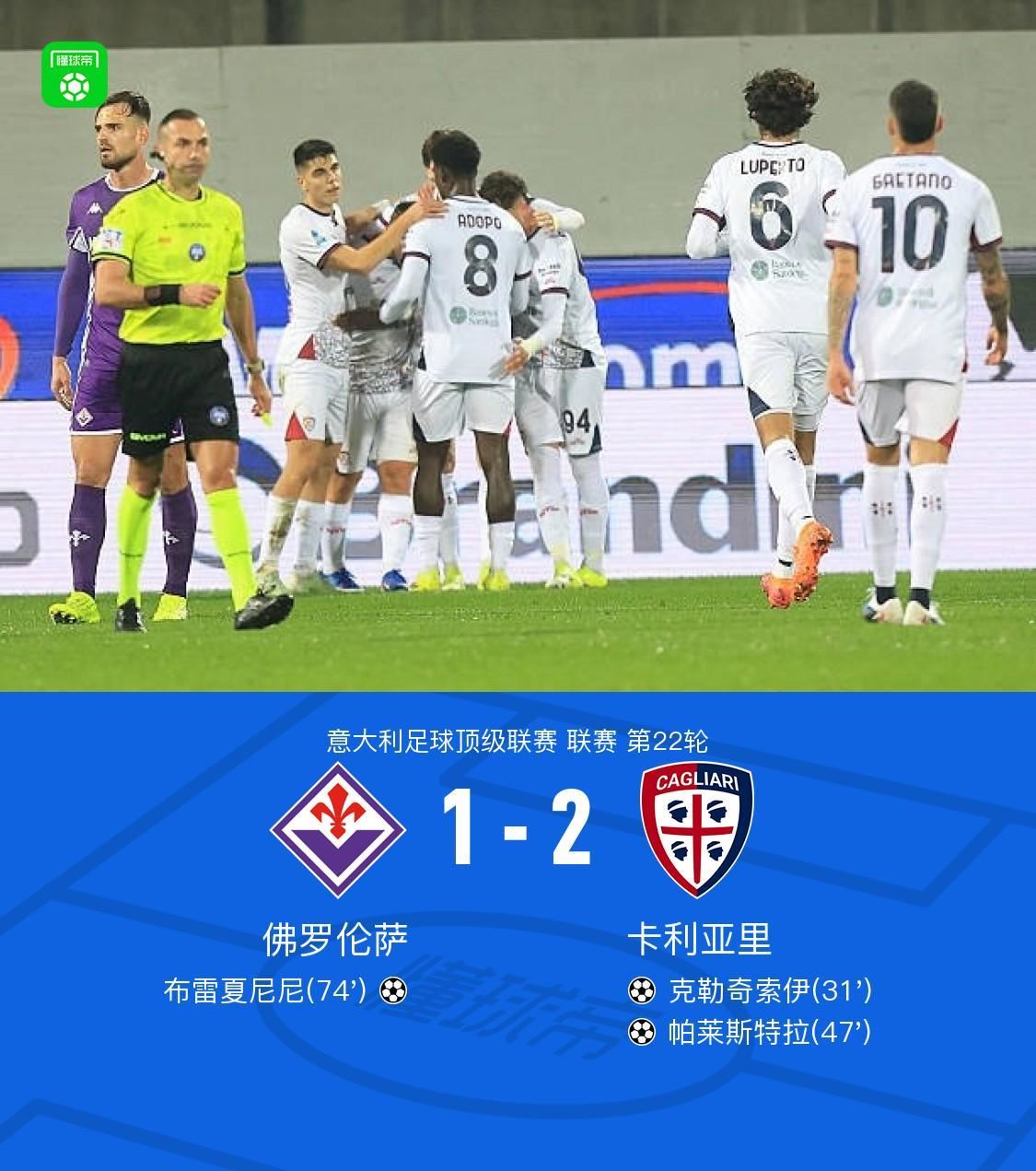 北京时间1月25日,意大利足球甲级联赛第22轮,佛罗伦萨主场对阵卡利亚里。比赛第31分钟,帕莱斯特拉送出助攻,克勒奇索伊破门得分;第47分钟,塞巴斯蒂亚诺-埃斯波西托助攻帕莱斯特拉再入一球;第74分钟,多多送出助攻,布雷夏尼尼为佛罗伦萨扳回一城。最终,佛罗伦萨1比2不敌卡利亚里。