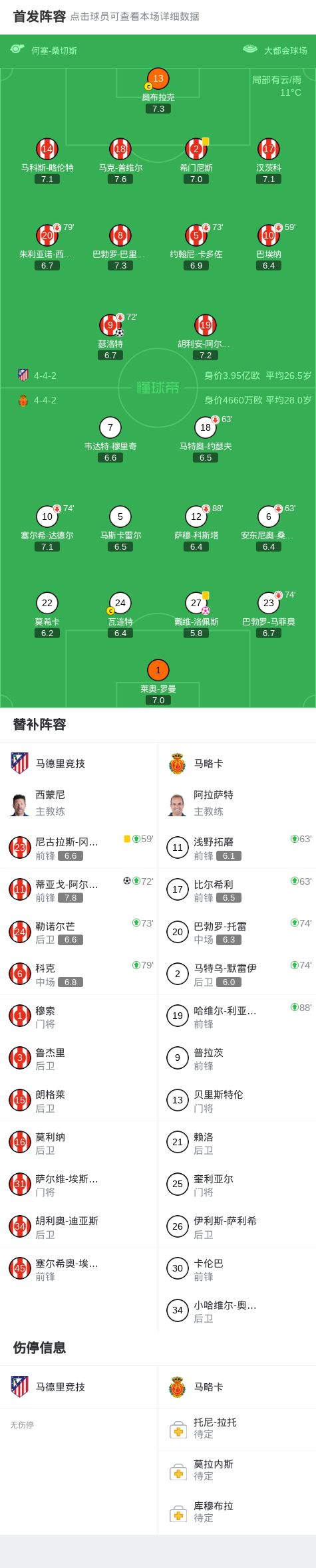 第75分钟,略伦特传中,默雷伊解围球打在洛佩斯脸上弹入球门,马竞2-0领先